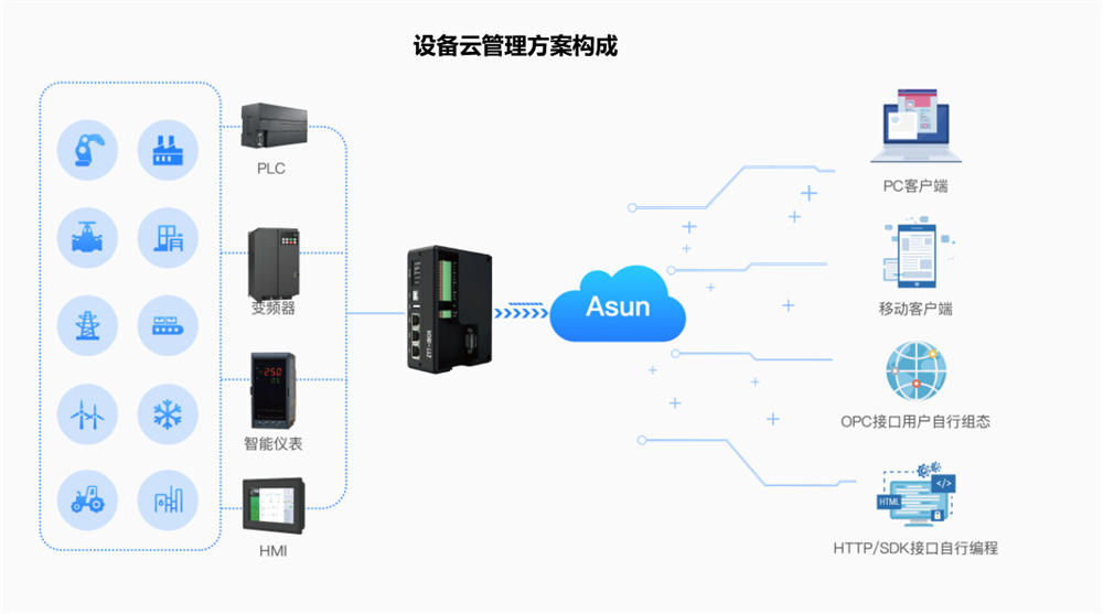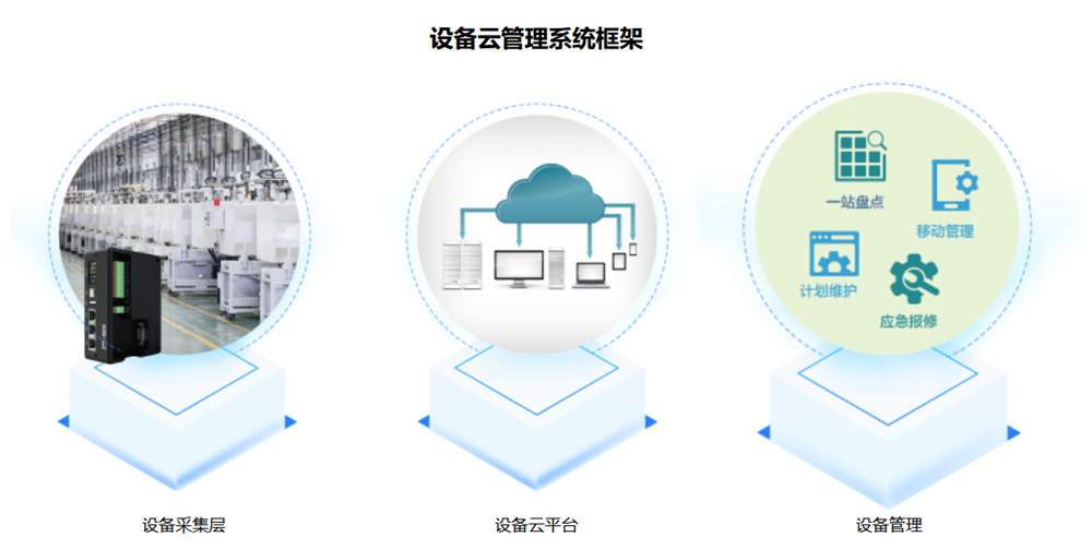 設備云平臺可接入各種工業設備,提供實時的設備狀態監控、數據采集、存儲、設備管理、遠程維護等功能, 從而實現設備管理的自動化、智能化。基于不同行業的設備管理的不同之處,為達到的用戶體驗,我們采用基于標準化產品+個性化定制的快速實施交付的項目模式,滿足不同客戶需求。